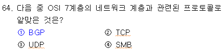 BGP : 라우팅(경로 설정) 프로토콜. 네트워크 계층과 관련. TCP : 전송 제어 프로토콜. 전송 계층과 관련. UDP : 사용자 데이터그램 프로토콜. 전송 계층과 관련. SMB : 서버 메시지 블록. 응용 프로그램 계층과 관련. |